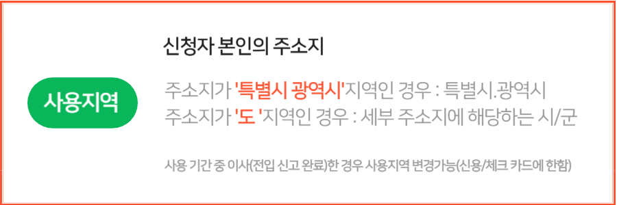 - 민생회복 소비쿠폰은 지역 민생경제 회복에 기여하고 지역 내 소상공인에게 힘이 될 수 있도록 사용 지역을 주소지 관할 지방자치단체로 제한한다. 즉, 특별시 또는 광역시 주민은 해당특별시/광역시에서,도 지역주민은 주소지 해당하는 시/군에서 사용 할 수 있다.