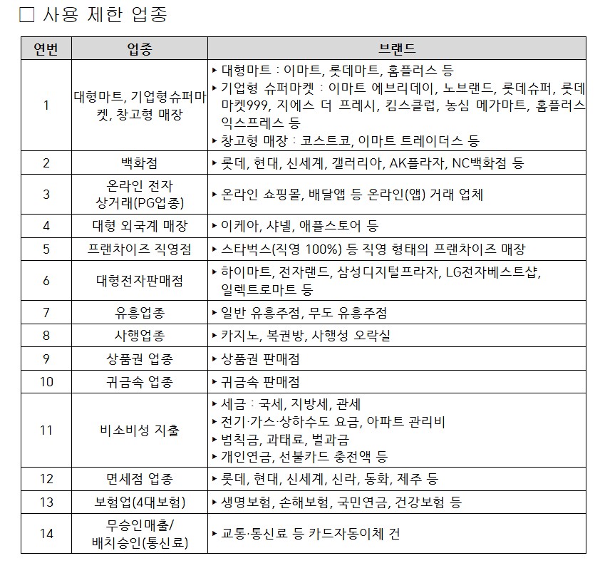 - 사용 제한 업종: 대형마트, 백화점, 온라인쇼핑몰, 유흥업소, 배달앱 등